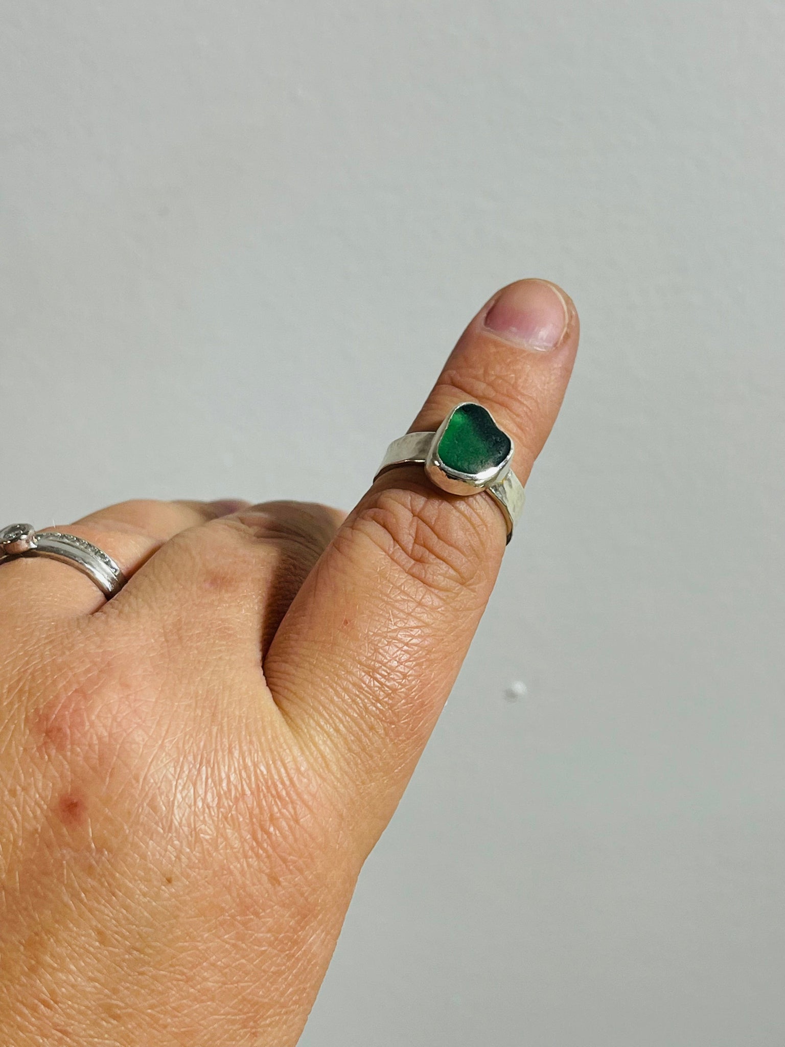 You can either select a 2mm round band with a hammered effect or a 5mm wide flat band with a hammered effect, as well as your ring size. You can also select whether you would like a ridge around the bezel of you sea glass see picture to decide.