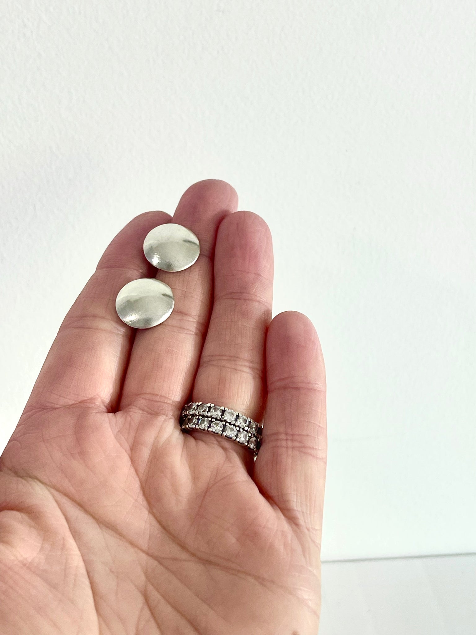 They measure approx 16mm wide by 0.8mm thick, a 10mm post length and sterling silver standard butterfly.